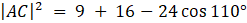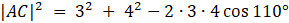Znajdź długość trzeciego boku trójkąta, mając dane |BC| = 3, |AB| = 4, |∢ABC| = 110°