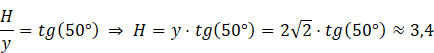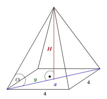 , a y jest równy jej połowie. Następnie z zależności trygonometrycznych w trójkącie prostokątnych wyznacz długość wysokości (H) ostrosłupa. W następnym kroku określ pole podstawy (Pp) oraz objętość (V) tej bryły.