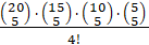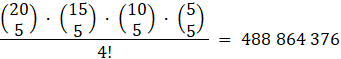 Wybierasz 5 książek z 20, następnie 5 książek z pozostałych 15, 5 z 10 i 5 z 5. Fakt, że pudełka nie są rozróżnialne, powoduje, że iloczyn otrzymanych wyników musisz podzielić przez 4!. (Przykładowo, gdyby chciało się rozmieścić 4 książki w 4 nierozróżnialnych pudełkach, to byłby na to 1 sposób – książka A znajdowałaby się w pudełku, książka B znajdowałaby się w pudełku i tak samo książki C i D, a wzór na to wyglądałby następująco: