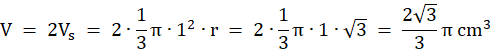 Objętość bryły jest równa sumie objętości dwóch stożków, każdy o promieniu podstawy 1 i wysokości r.