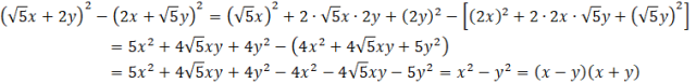 Na początku tego zadania musisz skorzystać ze wzoru na kwadrat sumy (a + b)2 = a2 + 2ab + b2. Po wyliczeniu i zredukowaniu sumy musisz skorzystać ze wzoru na różnicę kwadratów a2 – b2 = (a – b)(a + b). Na końcu musisz podstawić za x i y wartości z polecenia i wyliczyć wartość.