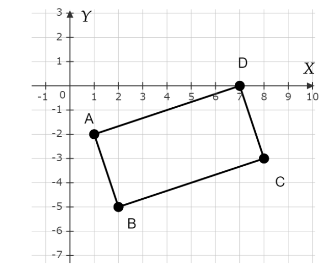 Mając naszkicowany cały równoległobok od razu zauważysz, że nie jest on ani kwadratem, ani rombem, bo boki nie są takiej samej długości. Do sprawdzenia czy równoległobok jest prostokątem, sprawdź, czy jego kąty są proste, np. poprzez wyliczenie współczynników kierunkowych prostych