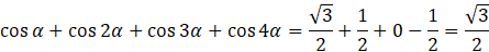 Dana jest suma: cos α + cos 2α + cos 3α + cos 4α. Wyznacz jej wartość dla α = -30°.
