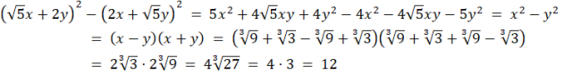 W pierwszej kolejności doprowadź podane wyrażenie algebraiczne do najprostszej postaci. Rozpisz oba kwadraty, zredukuj wyrażenia podobne, a następnie rozpisz różnicę kwadratów jako iloczyn. Wstaw podane wartości x i y, uprość wyrażenia w nawiasach i oblicz wartość liczbową całości.