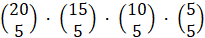 Wybierasz 5 książek z 20, następnie 5 książek z pozostałych 15, 5 z 10 i 5 z 5, co możesz zapisać jako