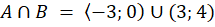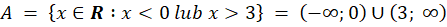 Zbiór A to zbiór wszystkich liczb rzeczywistych mniejszych od 0 lub większych od 3, czyli