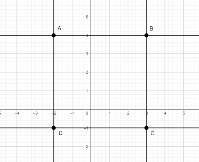 Przedstaw równania ogólne i kierunkowe prostych, które zawierają przekątne prostokąta ograniczonego przez proste x=2,x=3,y=1,y=4.
