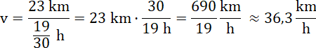 godziny). Teraz wykonaj obliczenia, pamiętaj, prędkość to iloraz drogi i czasu. Zastąp dzielenie przez ułamek, mnożeniem przez jego odwrotność, a za pomocą kalkulatora wymnóż otrzymany licznik i liczbę naturalną i podziel iloczyn przez liczbę z mianownika. Wynik zaokrąglij do pierwszego miejsca po przecinku (na drugim znajduje się jeden).