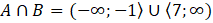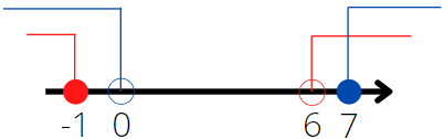 Pierwszy zbiór to suma przedziałów wszystkich liczb mniejszych bądź równych 0 lub większych od 6. Drugi to suma przedziałów wszystkich liczb mniejszych od 0 lub większych bądź równych 7. Aby ułatwić sobie wyznaczenie sumy i iloczynu tych przedziałów możesz je narysować na osi liczbowej.