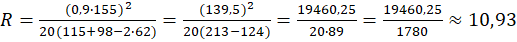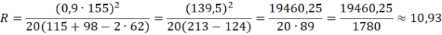 W tym zadaniu ustal, czy promień skrętu nart o wymiarach: L = 155 cm, S = 115 mm, W = 62 mm, H = 98 mm jest mniejszy od 21 cm. Wykorzystaj wzór: