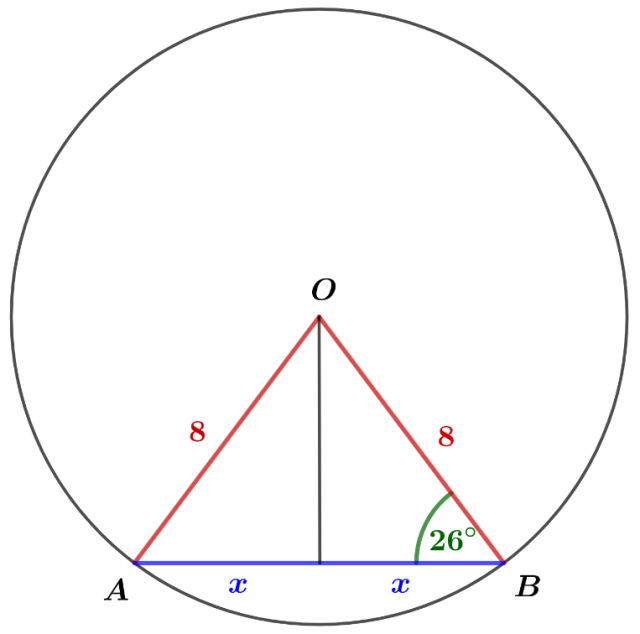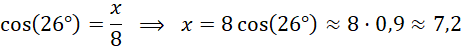 Sporządź rysunek przedstawiający trójkąt równoramienny, którego ramionami są promienie tego okręgu, równe 8, a podstawą – szukana cięciwa. Następnie poprowadź wysokość tego trójkąta i zauważ, że powstały dwa przystające trójkąty prostokątne. Następnie wyznacz funkcję cosinus kąta znajdującego się przy krótszej przyprostokątnej. Długość cięciwy jest równa podwojonej długości odcinka x.