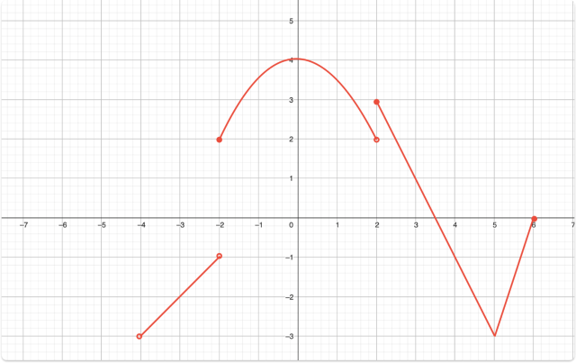 Funkcja rośnie w przedziałach: (4,-2), <-2,0>, <5,6>, funkcja maleje w przedziałach <0,2), <2,5>.