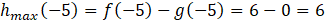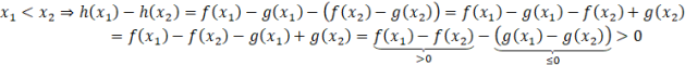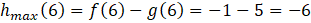 Popatrz jak będzie się „zachowywać” funkcja h(x). Jest to różnica wartości funkcji f(x) i g(x). Zaczynając od lewego krańca dziedziny, najpierw od stosunkowo dużej wartości funkcji f(x) odejmujesz 0 (bo tyle wynosi wartość g(x) w tym punkcie). Następnie od coraz mniejszych wartości funkcji f(x) odejmujesz coraz większe wartości g(x), w rezultacie czego funkcja h(x) maleje. I tak się dzieje praktycznie już do końca dziedziny. W końcowej części, gdzie funkcja g(x) staje się stała, od coraz mniejszych wartości f(x) odejmujesz stałą wartość, jednak to cały czas oznacza, że funkcja h(x) maleje. Więc funkcja h(x) maleje w całej swojej dziedzinie, więc wartość maksymalną będzie miała dla lewego końca dziedziny, zaś najmniejszą – dla prawego. Możesz to podsumować jako: