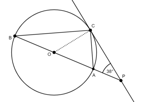 W tym zadaniu skorzystaj z własności kąta opartego na kącie półpełnym, kątów wpisanych, oraz kątów środkowych, opartych o ten sam łuk. Wykorzystaj również własność sumy kątów w trójkącie.