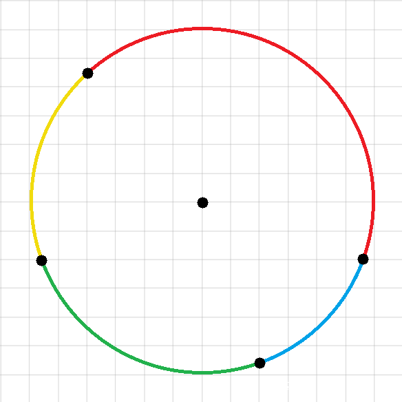 W tym zadaniu musisz policzyć łuki, których końce znajdują się w czterech różnych punktach na okręgu.