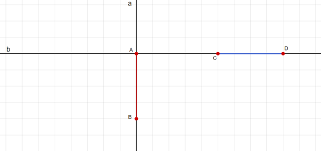 Musisz narysować odcinki AB i CD na prostych prostopadłych a i b, a następnie stwierdzić, jak te odcinki są względem siebie położone.