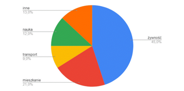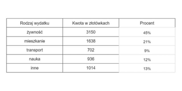 W tym zadaniu zaprezentuj w postaci procentowego diagramu kołowego, w jaki sposób rodzina państwa Miłych dysponuje swoim miesięcznym budżetem, jeśli na żywność przeznacza 3510 zł, na mieszkanie - 1638 zł, na transport-702 zł, na naukę dzieci - 936 zł, a pozostałe pieniądze - na inne wydatki.