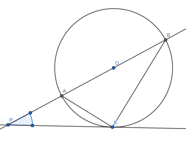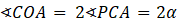 Rozwiązanie zadania zacznij od wykonania rysunku pomocniczego. Następnie zauważ, że kąt PCA jest kątem dopisanym do okręgu, a kąt COA kątem środkowym opartym na tym samym łuku, a zatem miara kąta środkowego jest dwukrotnie większa od miary kąta dopisanego. Wprowadź odpowiednie oznaczenia.