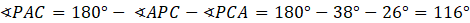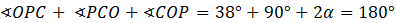 Z sumy miar kątów w trójkącie PCO wyznacz miarę kąta COA, a następnie na jej podstawie miarę kąta PCA. Z sumy miar kątów w trójkącie PCA wyznacz miarę kąta PAC, który jest przyległy do kąta CAB w trójkącie ABC.
