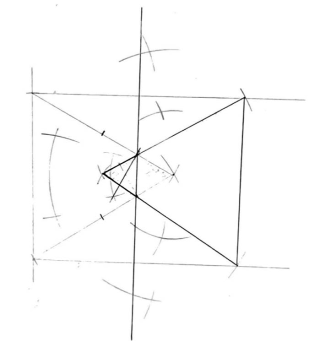 . Wyznacz romb utworzony przez wierzchołki symetrycznych do siebie trójkątów. Prosta, względem której są symetryczne, będzie krótszą przekątną tego rombu. Poprowadź proste prostopadłe do niej z pozostałych wierzchołków trójkąta i wyznacz drugi trójkąt równoramienny, znając jego długość boku oraz jeden z wierzchołków. Pozostałe wierzchołki będą w miejscu przecięcia łuku o promieniu równym długości boku z wierzchołka.