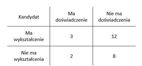 W tym zadaniu trzeba wyliczyć prawdopodobieństwo, że przy przypadkowym wyborze kandydata spośród tych o których informacje przedstawiono w tabeli, natrafi się na kandydata bez odpowiedniego wykształcenia lub doświadczenia.