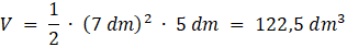 Przyprostokątne trójkąta w podstawie mają długości 7 dm, objętość to iloczyn pola podstawy i wysokości graniastosłupa: