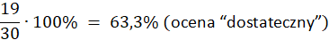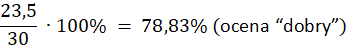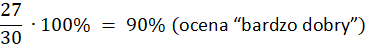 Nauczycielka ocenia sprawdziany zgodnie z poniższymi zasadami. Z testu można uzyskać maksymalnie 30 punktów. Kasia zdobyła 27 punktów, Arek - 11,5 punktu, Tomek - 19 punktów, Asia - 25 punktów, Iwona - 13 punktów, Karol - 23,5 punktu. Jakie oceny uzyskali?