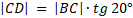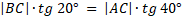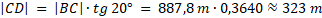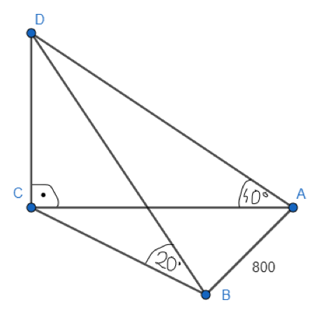 Punktem A, położonym na wschód od wieży, można zobaczyć szczyt pod kątem α = 40°. Z punktu B, który jest 800 m na południe od punktu A, widoczny jest szczyt wieży pod kątem β = 20° (zgodnie z rysunkiem). Oblicz wysokość wieży z dokładnością do 1 m.