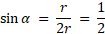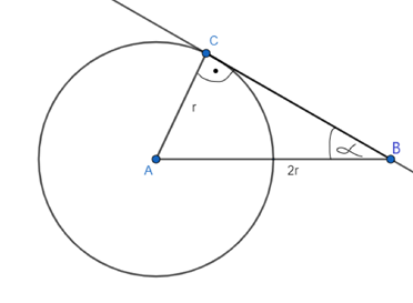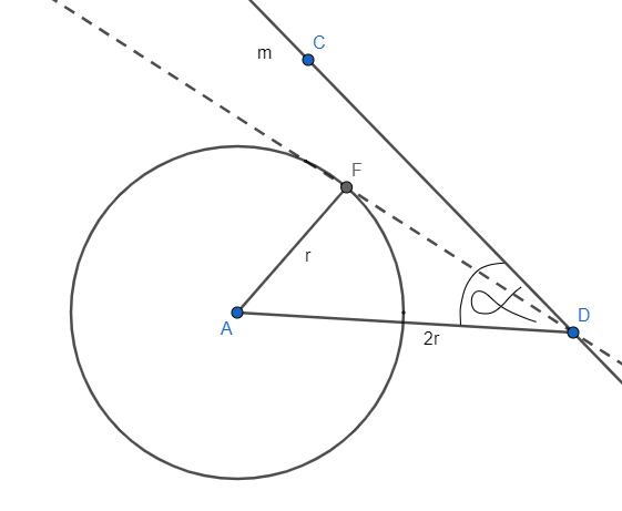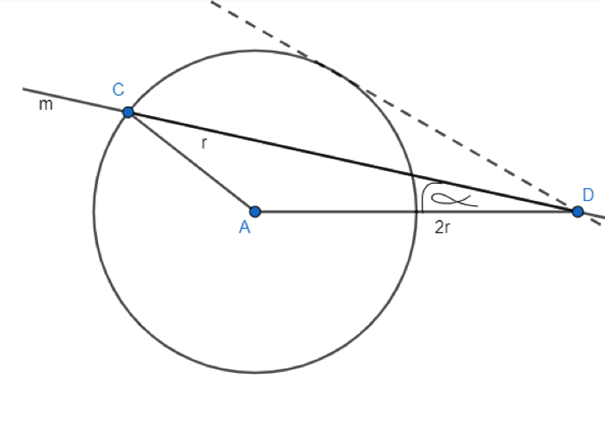 Dany jest okrąg o środku w punkcie A i promieniu r. Istnieje punkt B, taki że |AB| = 2r. W zależności od miary kąta α istnieje prosta m przechodząca przez punkt B i nachylona do prostej AB pod kątem ostrym α. Ustal, w zależności od miary kąta