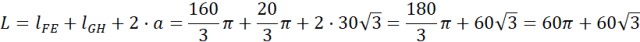 W tym zadaniu oblicz, jaka jest długość pasa wiedząc, że na dwóch kołach o promieniach 40 cm i 10 cm rozpięto pas transmisyjny (zob. rysunek z prawej), a odległość między środkami kół jest równa 60 cm.