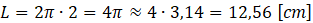 Oblicz długość najpierw jednego, a potem 10 okręgów o promieniu 2 cm. Następnie oblicz średnicę okręgu AB i długość okręgu o średnicy AB.