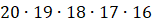 Wybieramy pierwszą osobę na 20 sposobów, drugą na 19, trzecią na 18, czwartą na 17 i piątą na 16. Wybierając grupę 15 osób musimy odrzucić pięć osób. Wybieramy pierwszą osobę na 20 sposobów, drugą na 19, trzecią na 18, czwartą na 17 i piątą na 16. Obie te grupy można wybrać na tyle samo sposobów.