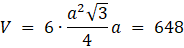 Dany jest graniastosłup prawidłowy sześciokątny o objętości 648. Dłuższa przekątna graniastosłupa i dłuższa przekątna podstawy tworzą kąt 30°. Wyznacz pole powierzchni bocznej.