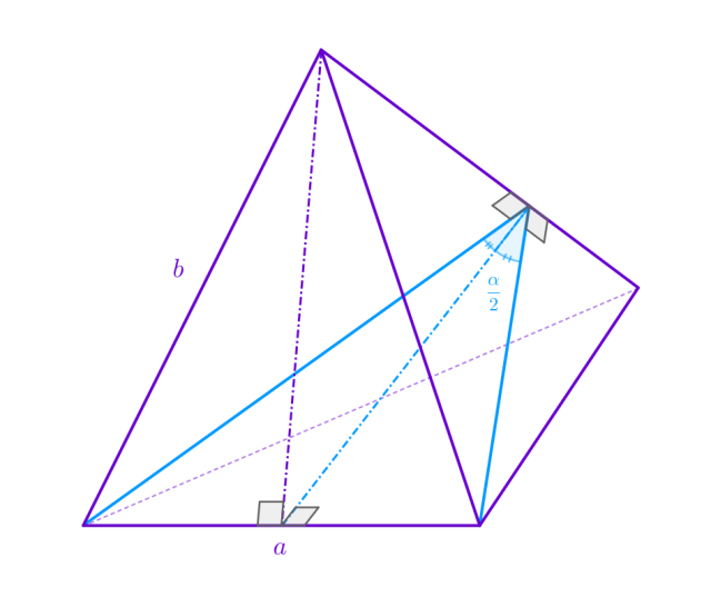Uzależnij długość ramion niebieskiego trójkąta od kąta dwuściennego α oraz długości krawędzi podstawy 𝑎: