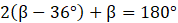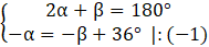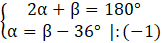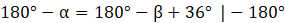 W trójkącie równoramiennym, kąt zewnętrzny przy podstawie jest większy o 36° od kąta zewnętrznego przy wierzchołku naprzeciwko podstawy. Wyznacz miary kątów trójkąta.