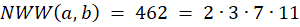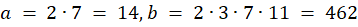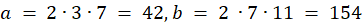 W pierwszym kroku rozbijamy podane NWD i NWW na czynniki pierwsze. W NWD pojawiają się czynniki 2 i 7, a więc muszą one występować w rozkładzie na czynniki obydwu liczb. Z kolei czynniki 3 i 11, które występują tylko w rozkładzie NWW muszą wystąpić w dokładnie jednej z dwóch liczb, więc rozdzielamy je na możliwe sposoby.