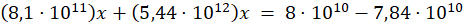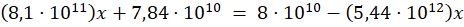 Przyrównaj do siebie oba wyrażenia i zapisz równanie z niewiadomą x. Przerzuć wszystkie wyrażenia z x na lewą stronę, a pozostałe na prawą stronę równania. Rozwiąż równanie i zapisz wynik przy pomocy notacji wykładniczej.
