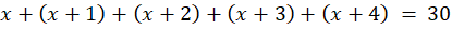 Niech dolnym krańcem przedziału jest x. x jest liczbą całkowitą, a więc pięć liczb całkowitych w przedziale to x, x + 1, x + 2, x + 3, x + 4. Zapisz równanie, że ich suma wynosi 30 i rozwiąż je. Górnym krańcem przedziału jest liczba całkowita, a więc jest ona równa x + 4. Gdyby była równa np. x + 5, to przedział zawierałby złą liczbę liczb całkowitych.
