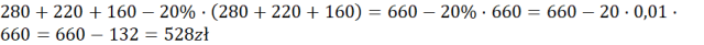 W tym określ, czy pani Kowalska dzięki promocji może pozwolić sobie jeszcze na kupno bluzki za 190 zł oraz spódnicy za 120 zł, czy też starczy jej tylko na jedną z tych rzeczy? Jeśli tak, to na którą? Pani Kowalska przeznaczyła na zakupy 700 zł. W odzieżowym centrum handlowym ogłoszono wiosenną promocję na wszystkie towary. Przy zakupie jednej rzeczy cena jest mniejsza o 10%, przy zakupie dwóch - o 15%, przy zakupie trzech o 20% za każdą sztukę. Pani Kowalska zdecydowała się kupić kurtki dla dzieci za 280 zł i 220 zł oraz sweter dla męża w cenie 160 zł.