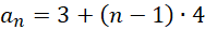 Oblicz różnicę ciągu ze wzoru na trzeci wyraz ciągu, który jest równy 11. Zapisz wzór ogólny ciągu. Oblicz wartość . Oblicz sumę piętnastu początkowych wyrazów o numerach nieparzystych.