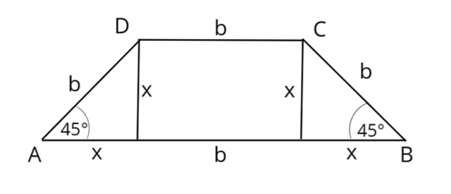 W tym zadaniu wyznacz długość dłuższej podstawy w trapezie równoramiennym, jeżeli kąt ostry trapezu wynosi 45°, a jego ramiona są długości krótszej podstawy.