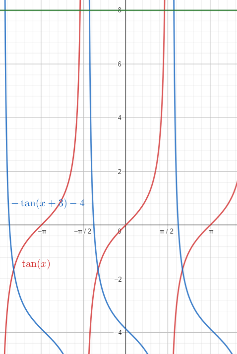 W tym zadaniu musisz powiedzieć, dla jakich x mieszczących się między –π a π funkcja f(x) = –tg (x + 3) – 4 jest równa 8.