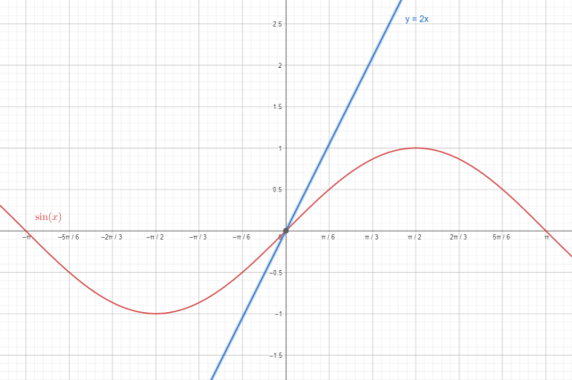 W tym zadaniu musisz po narysowaniu we wspólnym układzie współrzędnych wykresów funkcji f(x) = sin x i g(x) = 2x rozwiązać równanie f(x) = g(x).