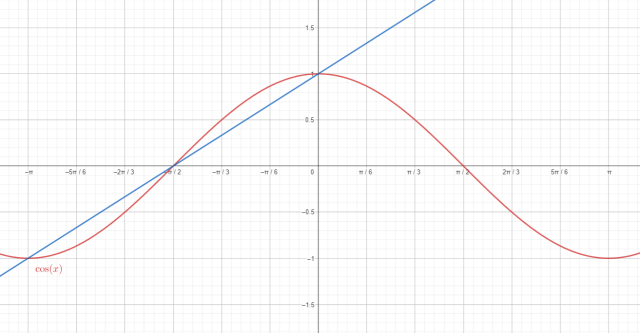 W tym zadaniu musisz po narysowaniu we wspólnym układzie współrzędnych wykresów funkcji f(x) = cos x i g(x) =