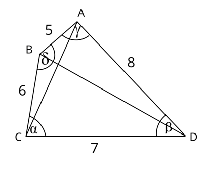 Znajdź miary kątów czworokąta ABCD, jeśli jest wpisany w okrąg i |AB| = 5, |BC| = 6, |CD| = 7 i |AD| = 8.