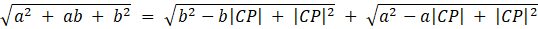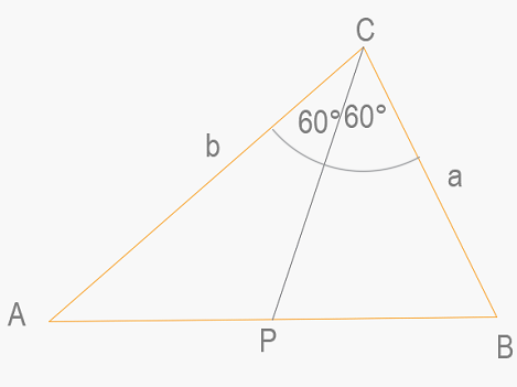Dany jest trójkąt ACB o bokach AB i AC odpowiednio długości a i b oraz o kącie ACB równym α = 120°. Znajdź długość odcinka CP, który jest dwusieczną kąta α.
