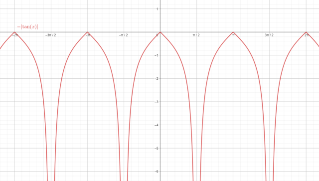 W tym zadaniu musisz powiedzieć, ile rozwiązań ma równanie f(x) = –|tg x|, jeśli x mieści się między –2π a 2π.