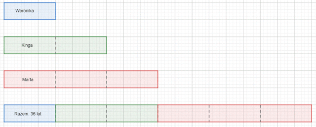 Narysuj odcinek, który przedstawia wiek Weroniki. Odcinek z wiekiem Kingi jest od niego 2 razy, a z wiekiem Marty – 3 razy dłuższy. Następnie połącz ze sobą te odcinki: razem przedstawiają 36 lat. Część Weroniki to jedna szósta całości, Kingi – jedna trzecia, a Marty – jedna druga (licz ilość najkrótszych odcinków, czyli odcinków Weroniki i dziel przez nie ilość tych odcinków w całym pasku). Mnóż otrzymane ułamki przez 36 – wyniki to ilość lat każdej z dziewcząt.