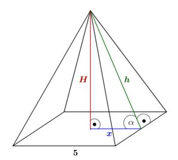 Wyznacz objętość ostrosłupa prawidłowego czworokątnego, w którym kąt nachylenia ściany bocznej do płaszczyzny podstawy ma miarę α oraz wymiary bryły są przedstawione na rysunku. Wynik podaj z dokładnością do części dziesiętnych.