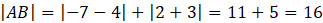 Odległość między wskazanymi punktami oblicz jako sumę odległość między ich pierwszymi i drugimi współrzędnymi, czyli moduły z ich różnic.